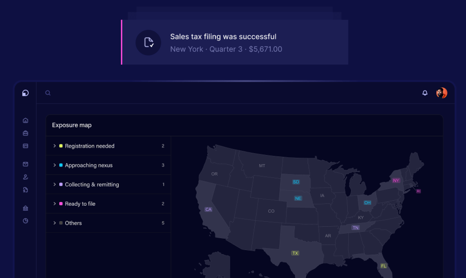Once onboarding is complete, your dashboard is live and ready. From this point forward, everything related to sales tax compliance happens directly in-app. Here are the features our app offers after you’re live.