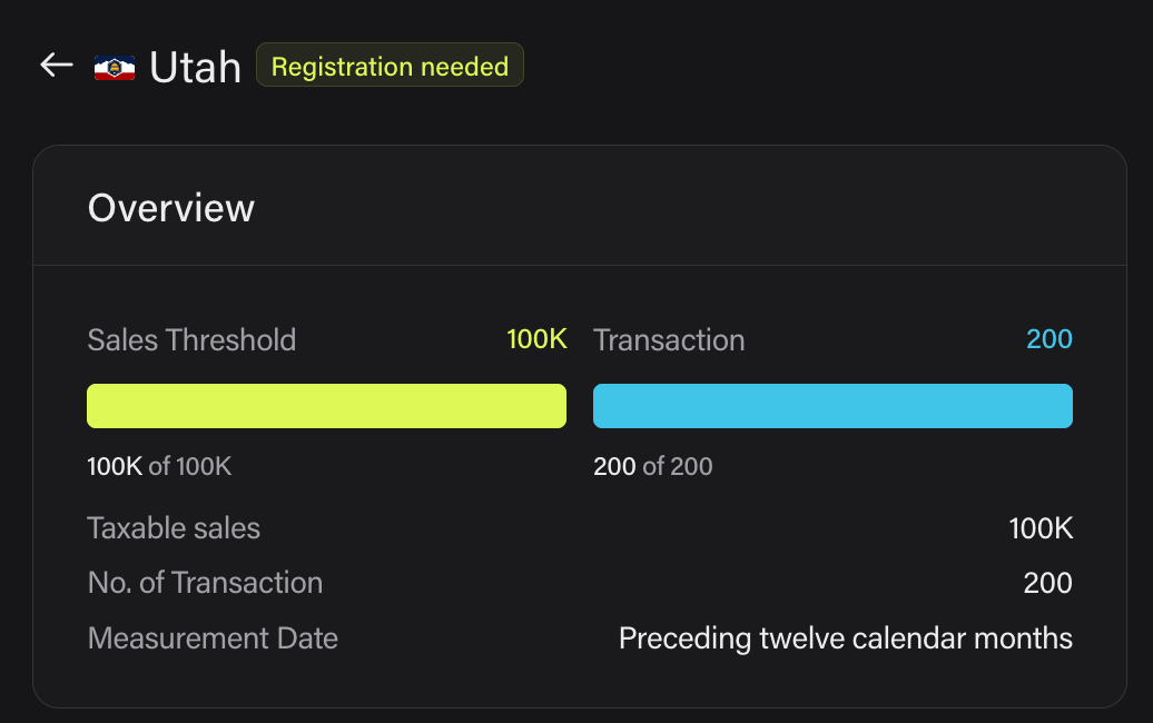 We track your SaaS company’s sales activities 24/7 and give you real-time visibility into each state’s thresholds and rules. Whenever a threshold is crossed, the registration process is triggered automatically, and the change appears directly in the state-specific cards.