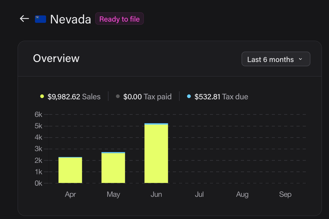 - Ready to file: A temporary status for states currently in the “collecting and remitting” stage. It indicates that sales taxes have already been collected, the amount due has been calculated, and the state is now ready for the filing and payment (remittance) process.