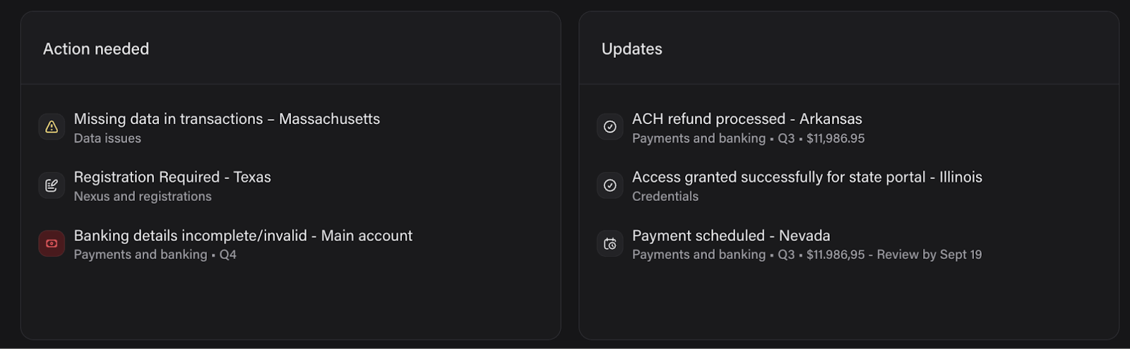 - Updates: where Firstbase keeps you informed of completed steps, like a payment being scheduled, a refund being processed, or access successfully granted to a state portal.